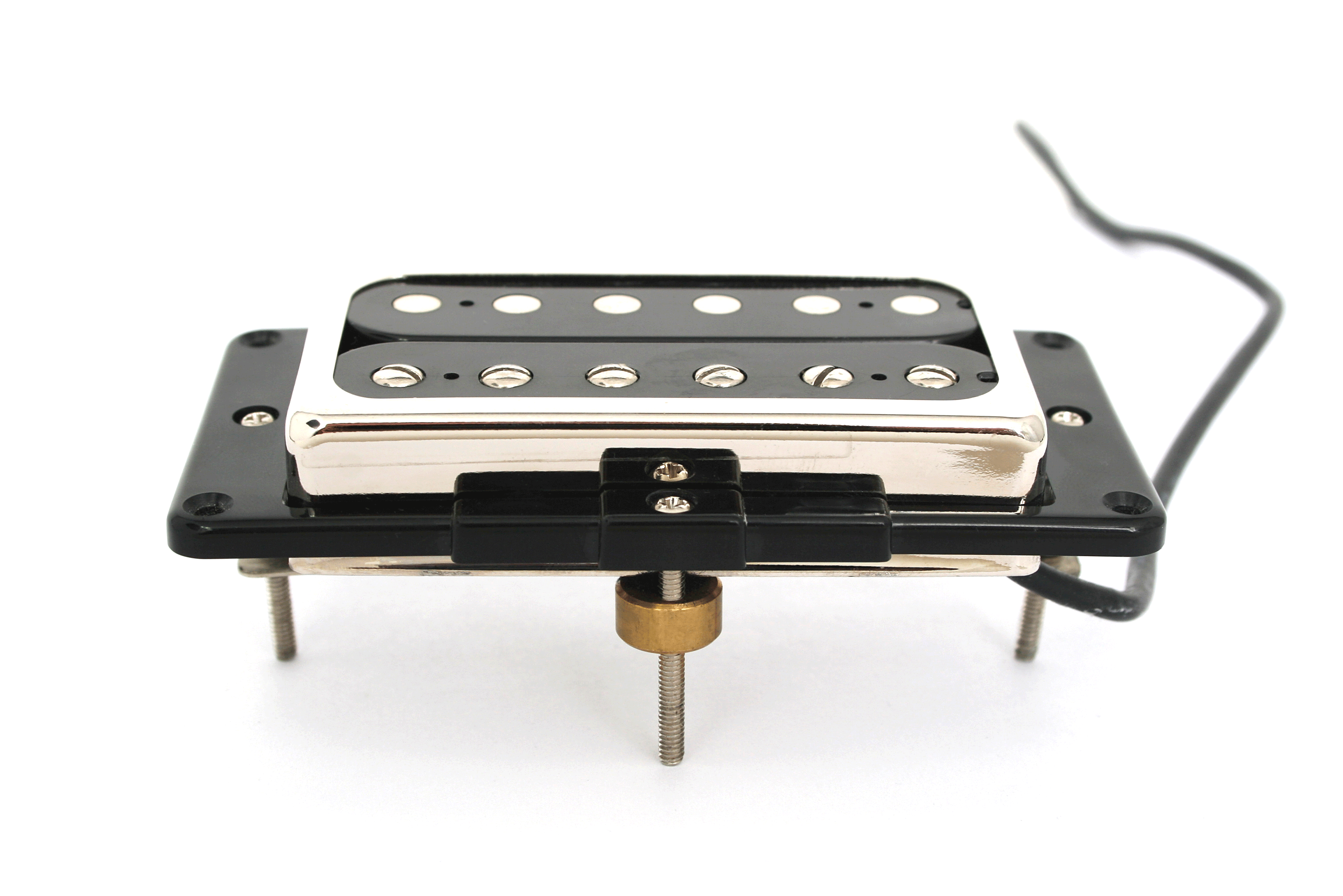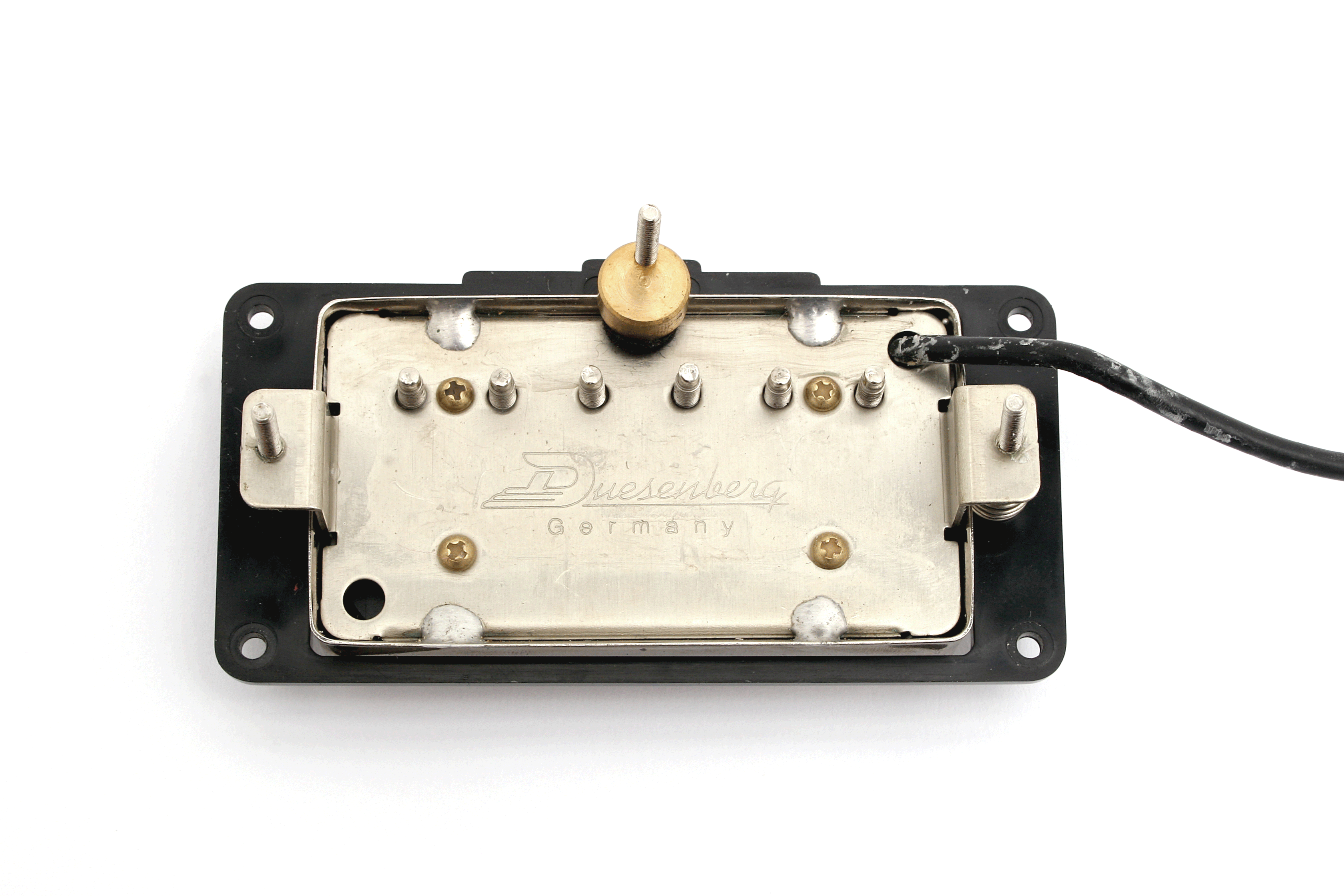 Mit diesem Rahmen und der mitgelieferten Schraube samt Metallscheibe lässt sich jeder Humbucker bzw. Pickup im Humbuckerformat so an- oder abkippen, dass die Oberfläche parallel zu den Saiten liegt. Die Pickupfräsung muss in den meisten Fällen im Bereich der Kipperscheibe etwas vergrößert werden. Das Format der Duesenberg-Rahmen ist leicht trapezförmig, um lückenlos an der Pickguardleiste anliegen zu können.