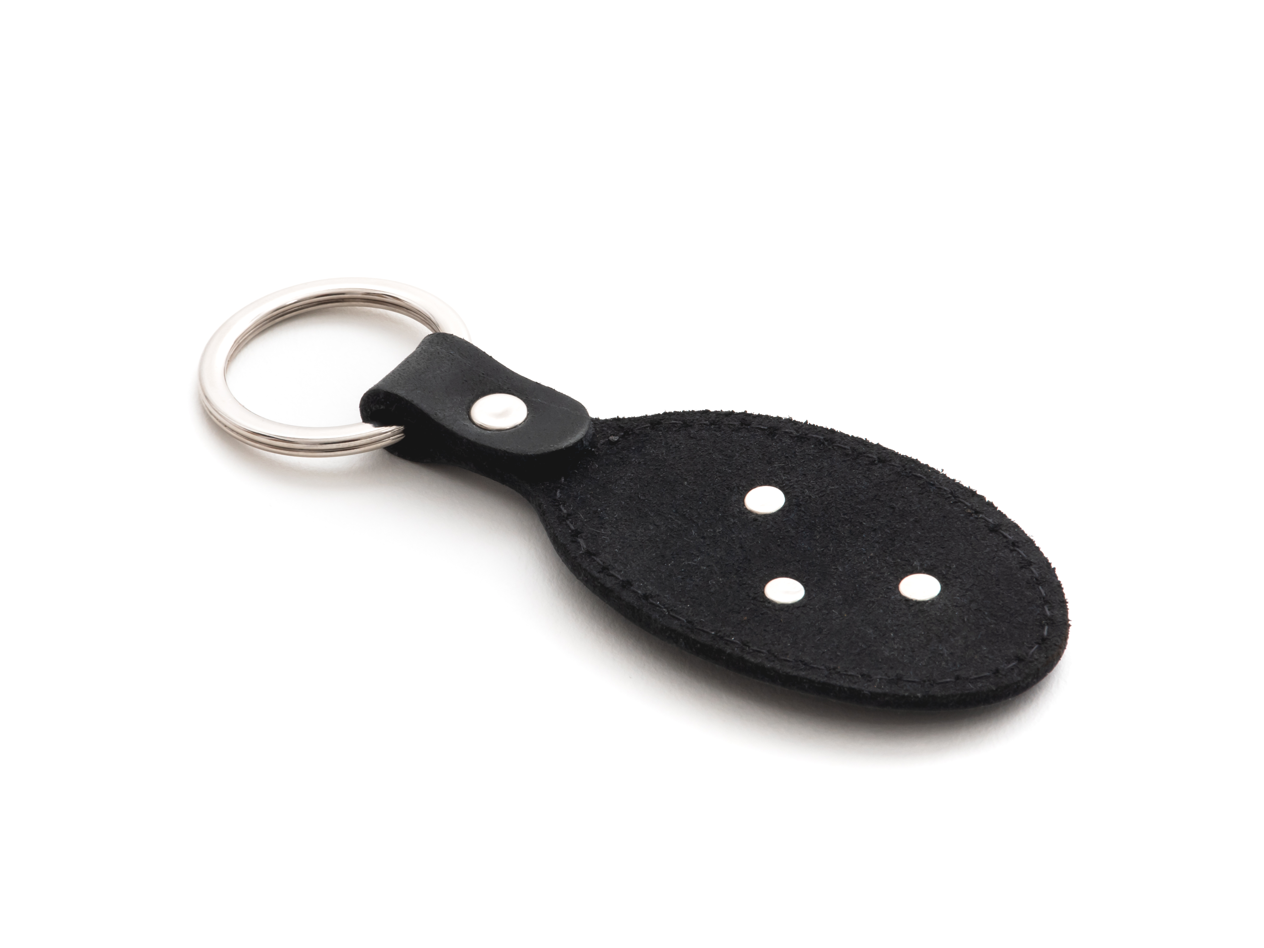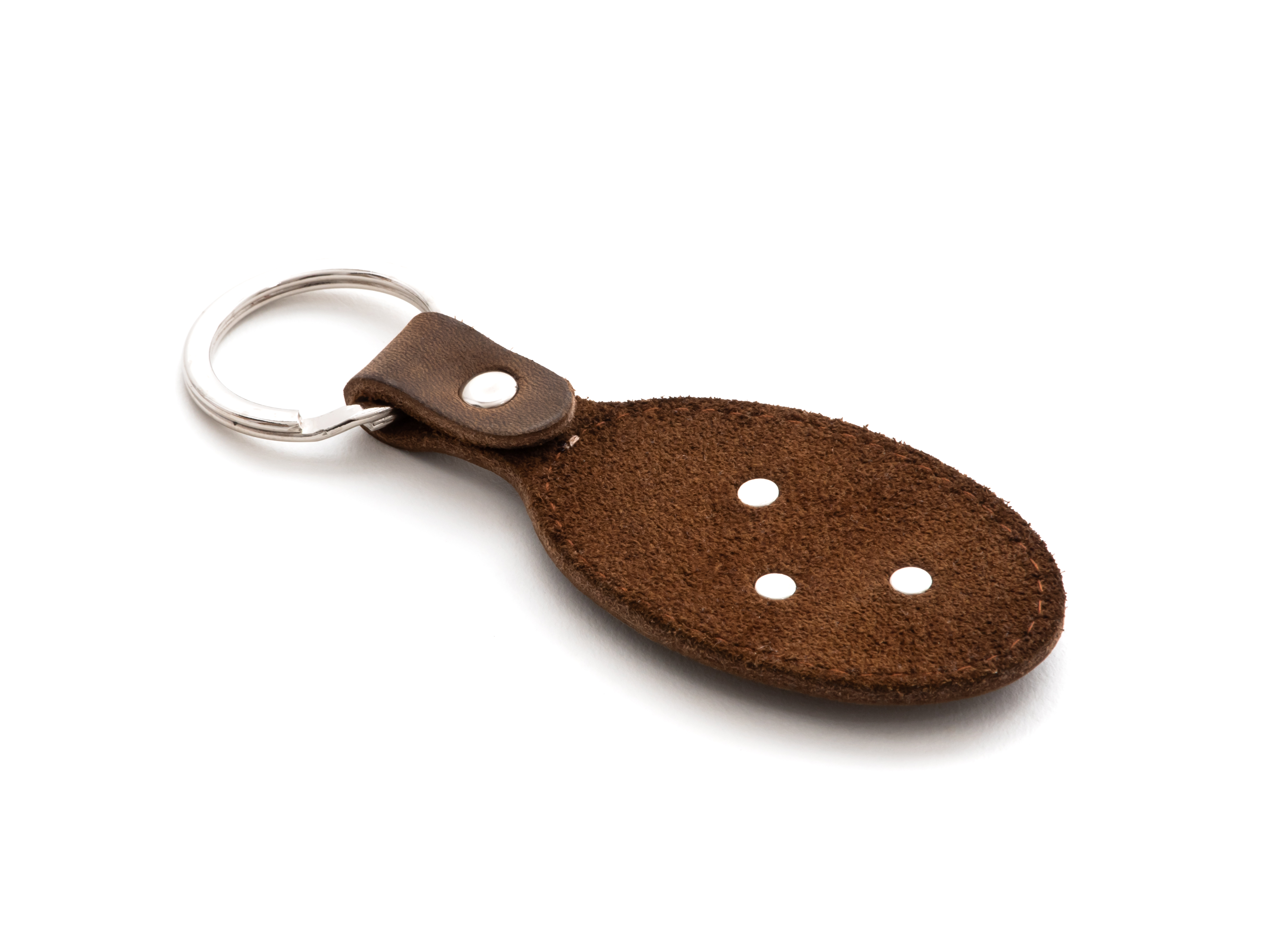 Ein handgemachter Schlüsselanhänger aus Echtleder mit aufgenietetem Metall Logo